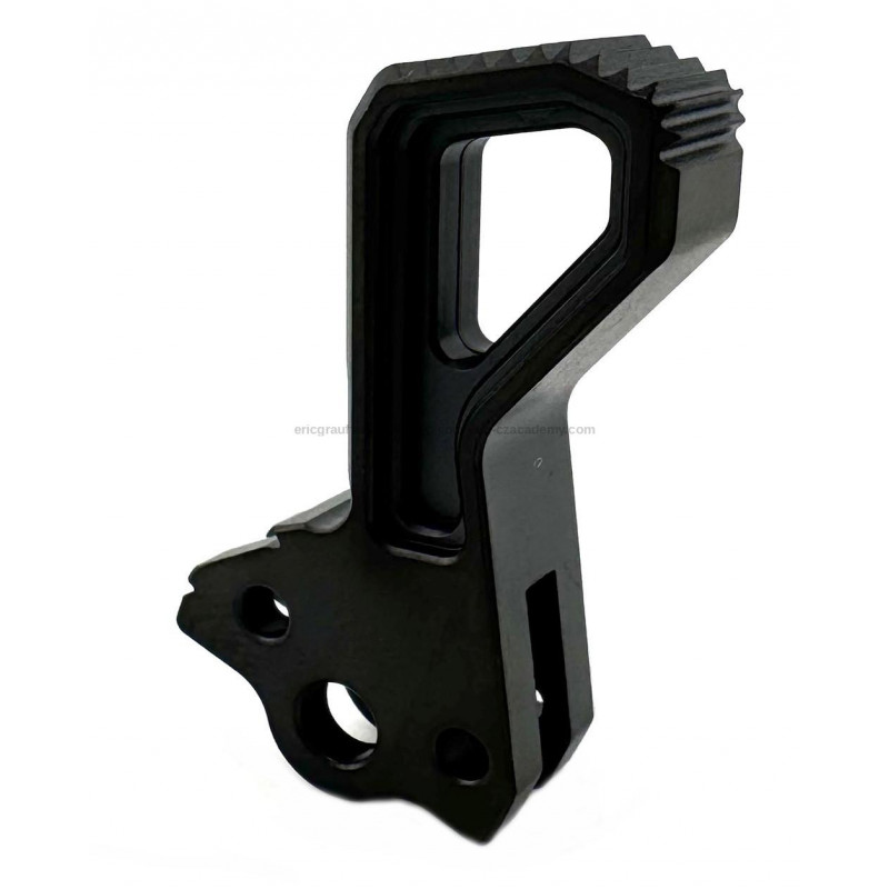 The Ultimate hammer is precision machined from a billet bar of high strength stainless steel. All critical dimensions are machined in a hardened state to guarantee the up most accuracy and sear interface. The hammer hooks are wire EDM, and then machine polished. The aggressive top serrations offer an aggressive bite to aid in manual de-cocking of the hammer.