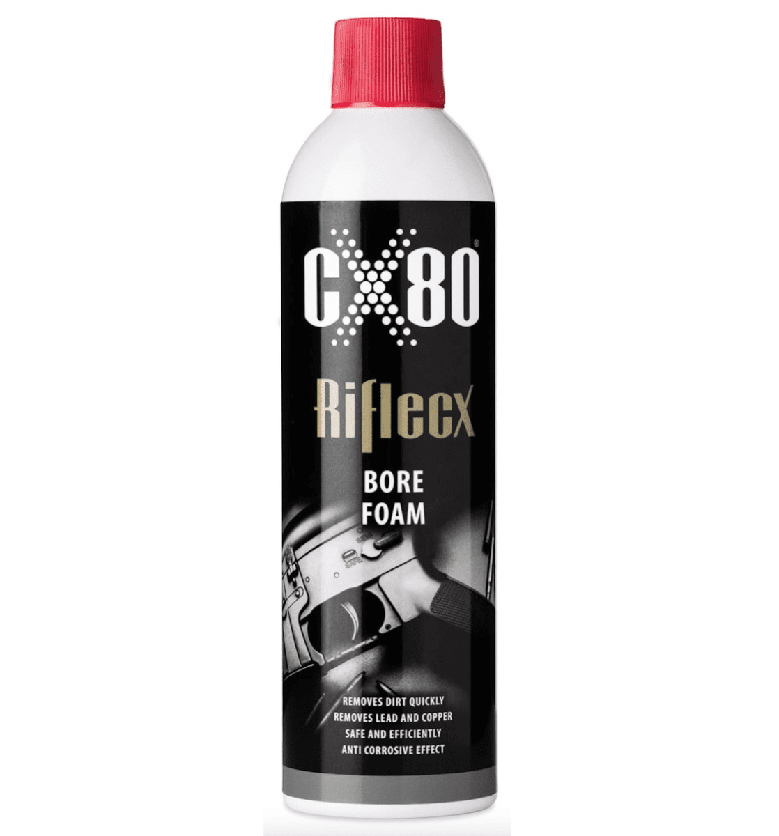 The foam, although intensive and removing powder residues (carbon build-up) and baked-on copper, nickel and lead deposits, is safe for the barrel grooves – suitable for all firearms. Thanks to its 60 cm long tube, it can be used to clean barrels of any length.